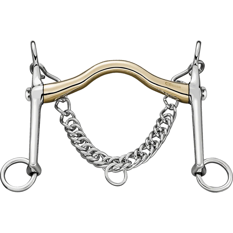 The Bemelmans Weymouth with 14mm Sensogan mouthpiece and revolving stainless steel cheeks is designed for horses requiring refined rein aids and tongue relief. The forward-angled port accommodates the palatal arch even with thick, fleshy tongues and promotes even pressure distribution, while the rotating cheekpieces allow for smoother rein transitions and reduced resistance.