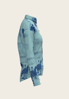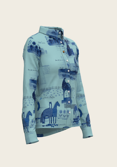 Each shirt features a center button panel accented by a custom gold Espoir button at the collar and matching gold buttons on each cuff—adding a refined touch to its athletic silhouette. The hand-illustrated fabric patterns bring artistry and individuality to every piece, making it a standout in both casual and equestrian wardrobes.